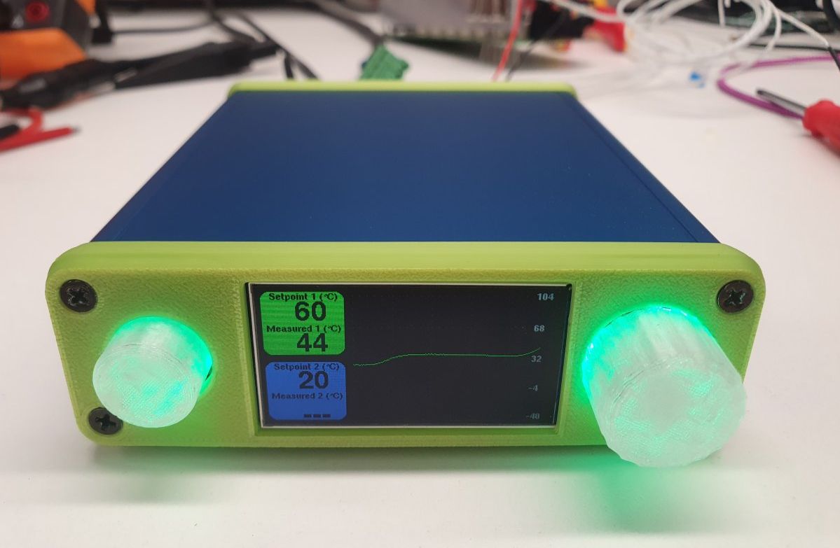 A built-in display shows real-time temperature plots for both channels, making it easy to monitor and adjust thermal behavior during testing.