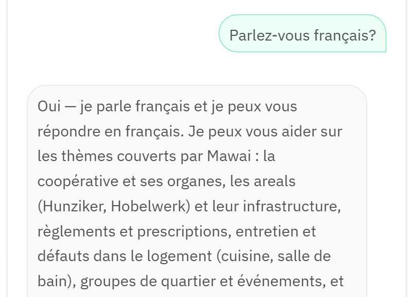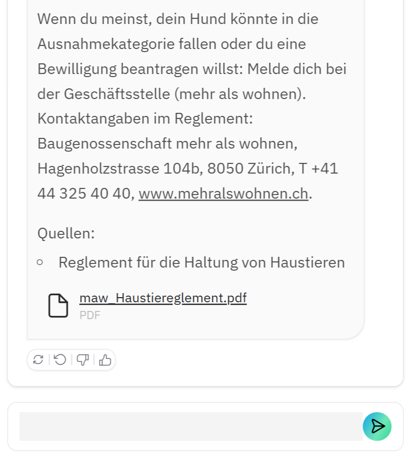 A customized AI model can make it easy for new and old tenants to get answers in natural language - whether thats German, English or Arabic. Hallucinations are a huge issue for AI answers, and great care has been taken to ensure correct replies - if the information available is insufficient, the AI will politely refer to the coop office. The source documents are also referred to and provided for instant download.