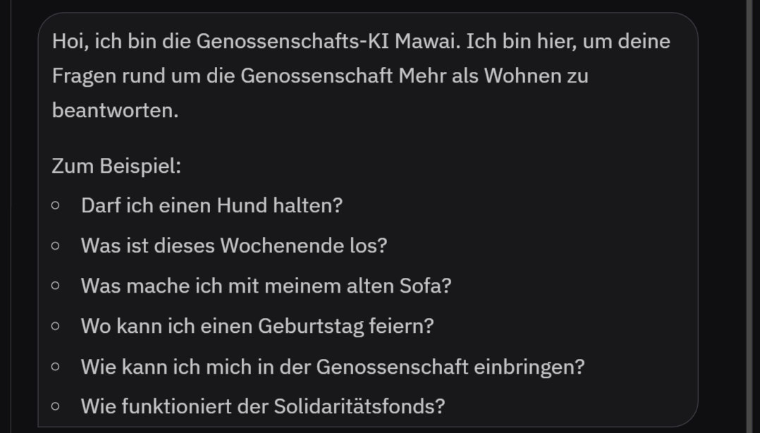 A customized AI model can make it easy for new and old tenants to get answers in natural language - whether thats German, English or Arabic. Hallucinations are a huge issue for AI answers, and great care has been taken to ensure correct replies - if the information available is insufficient, the AI will politely refer to the coop office. The source documents are also referred to and provided for instant download.